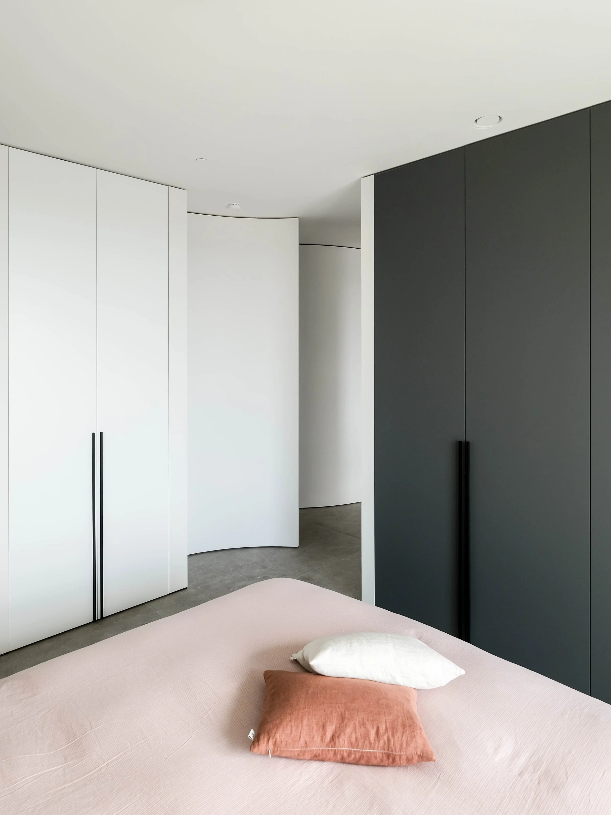 Slaapkamer met maatwerkkasten, airco en suite badkamer met inloopdouche afgewerkt in Mortex.