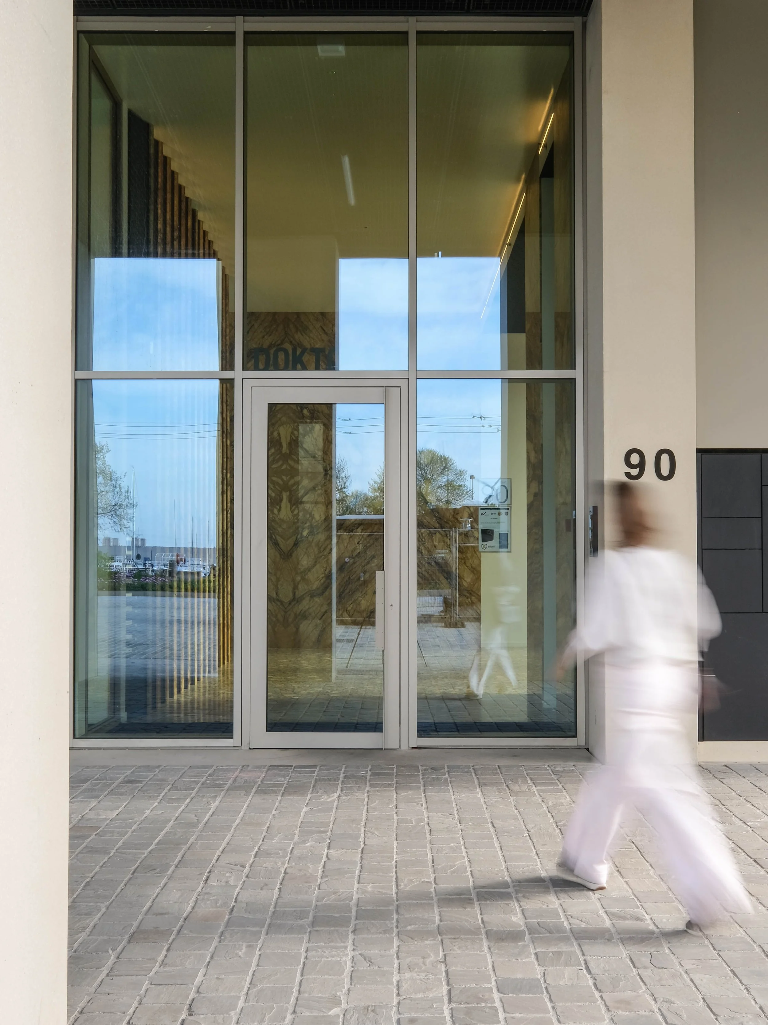 Imposante inkomhall met postbussen en e-box systeem, drie liften brengen je naar het appartement op de 19de verdieping.