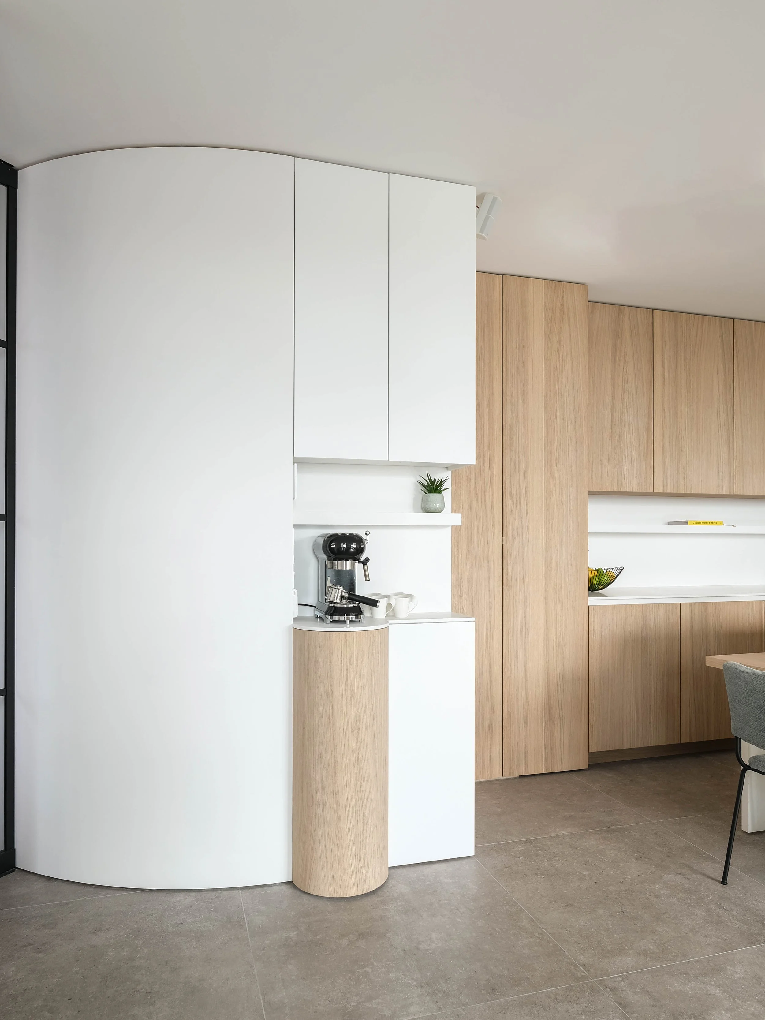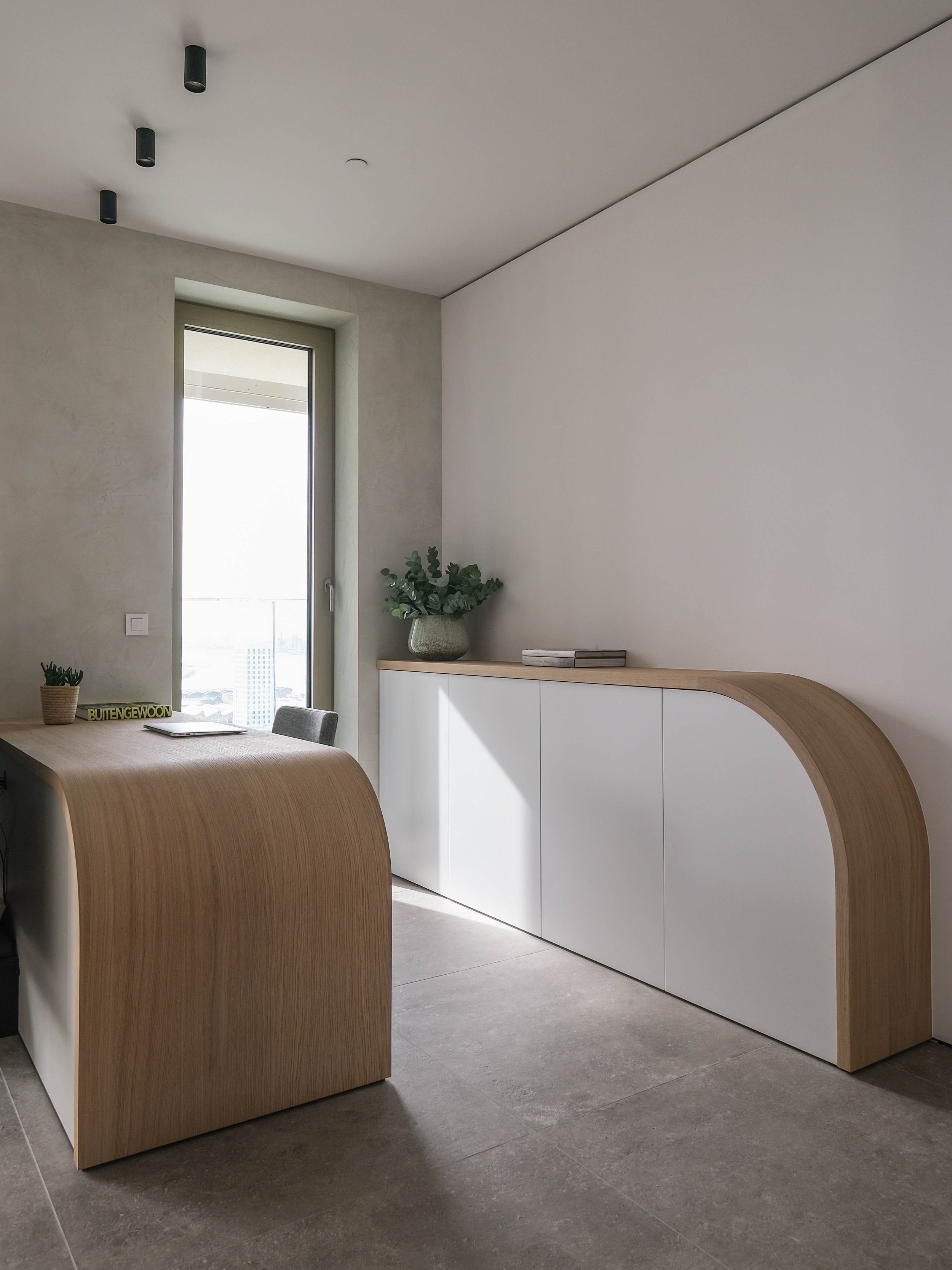 Open werkruimte met een maatwerk bureau en kast met mooie afgeronde vormen.
